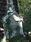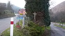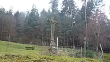 Sortie ouest de la localité bord sud de la localité bord sud de la D 39, près du carrefour formé avec la D 155 qui conduit au col de Fouchy – 965,23 x 81,55. Grande croix à crucifix en grès – Sculpteur : Sichler à Sélestat (Schlestadt) - Bras droits – Traverse et montant en partie chanfreinés. Sur le montant supérieur, INRI sur le linge plissé. Beau Christ, bien proportionné, tête penchée vers le côté, couronné d’épines, bras en V ouverts, périzonium plissé avec soin et recherche, retenu par une corde aux hanches, pieds juxtaposés. Au pied de la hampe, crâne et ossements. Piédestal supérieur en grande partie formé d’une niche à profil d’arc en plein cintre surmonté d’une assise de pierres entassées représentant le sommet du calvaire. Bordure saillante autour de l’arc ; fond de la niche en cul-de-four. Dans la niche, statuette de belle facture de la Vierge en prière, debout, mains jointes (hauteur : 0,45 m). Une doucine renversée fait le raccord du piédestal supérieur avec le piédestal inférieur quadrangulaire, plus haut surmonté d’un tailloir et reposant sur le socle taillé en amas de pierres empilées. Hauteur totale : 4,50 m – Croix : 2,35 x 1,35 m – Piédestal supérieur avec niche : 1,00 x 0,67 x 0,37 – Socle : 0,25 x 0,75 x 0,45. En bon état, fleurie, entourée d’un grillage. Inscriptions : Sur le fronton épousant le cintre de la niche : Mon Jesus Miséricorde / 100 jours d’indulgence. Sur le rebord du tailloir du piédestal : 0 Crux Ave Spes Unica. Sur la face avant du piédestal : Louanges et grâces soit à toi / Moment au très saint et très divin / Sacrement, et bénie soit la sainte / et immaculée conception de la Vierge Marie / 200 jours d’indulgence / …. / Hommage / D’amour et de reconnaissance / Envers la très Sainte Vierge / En souvenir des bienfaits / reçus / Érigée par la piété / des membres de la famille / Jean-Pierre Humbert et Marie Schmidt / Son épouse de Fouchy / le .