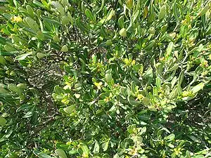 Arbrisseau de petite taille (inférieure à 1 mètre), très ramifié, à branches érigées. Feuilles persistantes, coriaces, sessiles, alternes, lancéolées à linéaires, pratiquement glabres, toujours ascendantes à érigées.