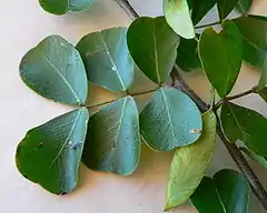 Les feuilles caduques de couleur vert clair sont paripennées et comprennent 1 à 4 paires de folioles obovales, luisantes et glabres de 1 à 3 sur 1 à 2,5 cm. Ces folioles en forme de cœur (base en coin et apex plus ou moins émarginé[4]) se rabattent l'une vers l'autre la nuit.
