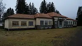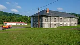 Cet édifice fut construit entre 1940 et 1946 en lieu et place de l’ancien logement des officiers. C’est sans doute le bâtiment le plus singulier du camp par sa volumétrie et ses nombreuses ornementations. Les façades nord et sud sont pourvues de trois avant-corps mettant en exergue la répartition des espaces intérieurs. Cette volumétrie singulière coûteuse répond malgré sa complexité à une logique fonctionnaliste que l’on retrouve également de manière plus conventionnelle sur l’ensemble du camp (volumétries simples et avant-corps moins prononcés).