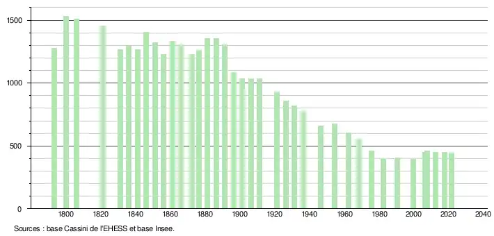 L'évolution du nombre d'habitants est connue à travers les recensements de la population effectués dans la commune depuis 1793. Pour les communes de moins de 10 000 habitants, une enquête de recensement portant sur toute la population est réalisée tous les cinq ans, les populations légales des années intermédiaires étant quant à elles estimées par interpolation ou extrapolation[46]. Pour la commune, le premier recensement exhaustif entrant dans le cadre du nouveau dispositif a été réalisé en 2007[47].