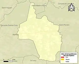 Le retrait-gonflement des sols argileux est susceptible d'engendrer des dommages importants aux bâtiments en cas d’alternance de périodes de sécheresse et de pluie. Aucune partie du territoire de la commune n'est en aléa moyen ou fort (19,2 % au niveau départemental et 48,5 % au niveau national). Sur les 469 bâtiments dénombrés sur la commune en 2019, aucun n'est en aléa moyen ou fort, à comparer aux 17 % au niveau départemental et 54 % au niveau national. Une cartographie de l'exposition du territoire national au retrait gonflement des sols argileux est disponible sur le site du BRGM[21],[Carte 2].