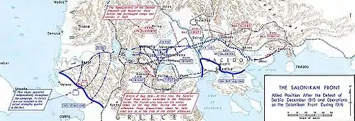Pendant une grande partie de l'année 1917, le front albanais reste stationnaire : les Italiens effectuent des bombardements aériens périodiques sur la base austro-hongroise de Durrës, mais ne tentent pas d'opérations terrestres majeures. À la fin du mois d'octobre, face à la retraite catastrophique consécutive à la défaite dans la bataille de Caporetto, une proposition est faite de rappeler le corps expéditionnaire stationné en Albanie, mais également en raison de l'opposition du haut commandement de la Marine, qui considère la possession de Vlora d'une importance vitale pour le maintien du blocus du canal d'Otrante, et la stabilisation de la situation sur le fleuve Piave, la proposition est abandonnée[29]. L'Armée alliée de l'Est reprend ses attaques sur le front bulgare et, entre mars et mai 1917, une série d'opérations concerne la zone située entre le lac Ohrid et le lac Prespa, à la frontière entre l'Albanie et la Macédoine (dite "deuxième bataille de Monastir") : le terrain gagné par les Français est en grande partie perdu dans les contre-attaques des unités bulgaro-allemandes et l'action se solde par un échec pour les Alliés[30]. Un succès limité est obtenu le 7 septembre 1917, dans le secteur du lac Ohrid: un groupe divisionnaire français, soutenu par environ un millier d'Albanais de la république de Coriza, lance une attaque victorieuse contre les lignes bulgares qui aboutit à la prise de la ville de Pogradec. Les échecs répétés sur le front de Salonique, ainsi que la volonté de se réconcilier avec les Alliés, entraînent le rappel du général Sarrail le 14 décembre 1917, qui est remplacé par le général Adolphe Guillaumat, lui-même remplacé le 17 juin 1918 par le général Louis Franchet d'Espèrey[30].