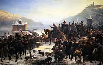 Le 31 décembre, l'armée de Silésie, commandée par le Feldmarschall Blücher, traverse le fleuve en Rhénanie : le corps russe de Saint-Priest devant Coblence, ceux de Langeron (russe) et Yorck (prussien) devant Kaub et Bacharach. Blücher, pour bénéficier de l'effet de surprise, a choisi un passage d'accès difficile, les rives du Rhin étant très escarpées dans ce secteur, mais, de toute façon, l'armée française de Rhénanie commandée par Marmont, peu nombreuse et minée par une épidémie de typhus, n'est pas en mesure de s'y opposer[8]. Les coalisés peuvent entreprendre le siège de Mayence, bloquée par le corps de Langeron à partir du . Marmont, après quelques combats de retardement, se replie vers la Lorraine le 9 janvier[9].