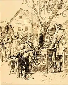 Cependant, Yorck est entré en contact avec le général russe d'origine allemande Diebitsch qui commande l'avant-garde de Wittgenstein : le 30 décembre 1812, il signe avec lui la convention de Tauroggen qui neutralise le corps prussien et prévoit son retour pacifique en Prusse[32]. Massenbach, qui était arrivé à Tilsit, est informé de cette convention et, après s'être concerté avec ses officiers, repasse le Niémen gelé pour aller se joindre à Yorck[33].