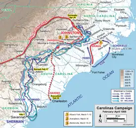 La campagne de Sherman dans les Carolines, au cours de laquelle il fit parcourir à ses hommes près de 700 km en 50 jours, était comparable à sa marche à travers la Géorgie, bien que plus exigeante physiquement. Cependant les forces confédérées qu'il y affronta était bien moindres et beaucoup plus démoralisées. Quand Joseph E. Johnston rencontra Jefferson Davis à Greensboro à la mi-avril, il dit au président de la Confédération :