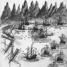Le sultan désirant le retour de la flotte de Piri Reis à Suez nomme Murad Reis, ancien gouverneur de Qatif sur la côte du golfe Persique amiral d'Égypte et lui ordonne de ramener la flotte à bon port[16]. Il fait donc le voyage par terre d'Istanbul à Bassorah en et prend le commandement de la flotte. Quinze galères et un galion prennent le départ en août, les autres navires sont laissés à quai. Les Portugais sont avertis des mouvements ennemis et interceptent la flotte dans le détroit d'Ormuz[16]. Durant le combat qui s'ensuit, le navire amiral du commandant Diogo de Noronha est coulé par les canons ottomans mais ce dernier a le temps de quitter le bord à temps[16]. L'affrontement tourne finalement à l'avantage des Portugais qui tuent deux commandants ainsi que de nombreux marins ottomans et coulent plusieurs navires. Murad Reis décide en conséquence de se replier vers Bassorah[16].