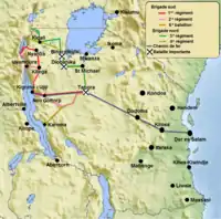 Le , elle occupe ses quartiers à Dodoma et à Kilosa. Le , après avoir été rejointe par la « brigade nord »[20], la Force publique se met en route avec Mahenge, le quartier général de von Lettow-Voorbeck, comme objectif.