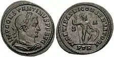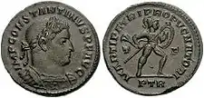 | CONST-ANTINVS AVG(ustus), l'empereur tête laurée et buste cuirassé, vers la droite. | La légende VIRTUS EXERCIT(us) (la vertu de l'armée), encadre un labarum portant l'inscription VOT/XX (vœux pour les deuxième decennalia l'accession au trône) sur deux lignes. Deux prisonniers, sons assis aux pieds de l'étendard, dos à dos, enchaînés. S U T en exergue en bas de la monnaie, signifiant "deuxième atelier monétaire de Ticinum". |