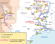 - Campagne du Nouveau-Mexique : Partis de Fort Bliss, au Texas, les confédérés remontent vers le nord la vallée du Rio Grande. Malgré leur victoire à Valverde, ils ne peuvent se rendre maîtres de Fort Craig, principale place nordiste de la région, et continuent vers Santa Fe qu'ils investissent le 13 mars 1862. Voulant attaquer Fort Union, dans la vallée du Pecos, ouvrant la voie aux grandes plaines de l'Est des montagnes Rocheuses, ils se heurtent aux nordistes à Glorieta Pass. Vainqueurs, ils sont tout de même obligés de se replier, à la suite de la destruction de leur convoi de ravitaillement, et de regagner le Texas et de laisser leurs gains territoriaux et l'Arizona confédéré aux mains des yankees.