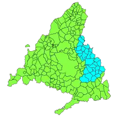 Cette comarque est divisée en deux parties, dont les limites sont fixées par la frontière entre la communauté de Madrid à l'ouest et la communauté autonome de Castille-La Manche à l'est :