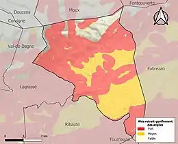 Le retrait-gonflement des sols argileux est susceptible d'engendrer des dommages importants aux bâtiments en cas d’alternance de périodes de sécheresse et de pluie. 89,3 % de la superficie communale est en aléa moyen ou fort (75,2 % au niveau départemental et 48,5 % au niveau national). Sur les 247 bâtiments dénombrés sur la commune en 2019, 247 sont en aléa moyen ou fort, soit 100 %, à comparer aux 94 % au niveau départemental et 54 % au niveau national. Une cartographie de l'exposition du territoire national au retrait gonflement des sols argileux est disponible sur le site du BRGM[29],[Carte 3].