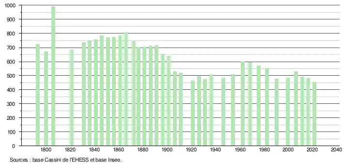 L'évolution du nombre d'habitants est connue à travers les recensements de la population effectués dans la commune depuis 1793. Pour les communes de moins de 10 000 habitants, une enquête de recensement portant sur toute la population est réalisée tous les cinq ans, les populations légales des années intermédiaires étant quant à elles estimées par interpolation ou extrapolation[24]. Pour la commune, le premier recensement exhaustif entrant dans le cadre du nouveau dispositif a été réalisé en 2006[25].