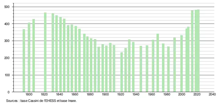 L'évolution du nombre d'habitants est connue à travers les recensements de la population effectués dans la commune depuis 1793. Pour les communes de moins de 10 000 habitants, une enquête de recensement portant sur toute la population est réalisée tous les cinq ans, les populations légales des années intermédiaires étant quant à elles estimées par interpolation ou extrapolation[24]. Pour la commune, le premier recensement exhaustif entrant dans le cadre du nouveau dispositif a été réalisé en 2008[25].