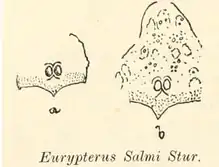 La seconde espèce de Campylocephalus décrite, en 1877, C. salmi, est initialement attribuée au genre Eurypterus, apparenté mais cependant assez éloigné, par le géologue et paléontologue slovaque Dionýs Štúr. La description de Štúr est basée sur deux carapaces fossiles incomplètes. La première carapace fragmentaire ne comporte que la partie inférieure de la tête, terminée par deux arcs brisés et concaves. Les yeux de cette carapace sont proches l'un de l'autre, positionnés au milieu de la carapace sur une partie surélevée de forme triangulaire semblable à celle de certains spécimens de l'espèce apparentée Hibbertopterus scouleri. La deuxième carapace fossile présente la particularité de commencer à s'étendre vers l'avant au-dessus des yeux. Ces deux fossiles présentent également des protubérances de différentes tailles, réparties sur l'exosquelette, de formes vagues et encore jamais vues sur les autres spécimens du genre[5].