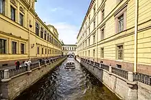 Le canal d'Hiver a été creusé en 1718-1719, tandis que les quais de granite ont été construits en 1782-1784 et que les parapets avec leurs grilles métalliques ont été dessinés par I. Dunker à la même époque. Il se termine par un bâtiment en arc, construit par Veldten, qui relie le palais d'Hiver, ou Vieil Ermitage, au théâtre de l'Ermitage en enjambant le canal. C'est l'une des vues les plus pittoresques de l'ancienne capitale impériale.