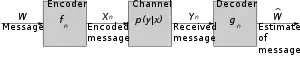 - La probabilité d'erreur . Dans le cas d'un canal discret (et en supposant que est tiré uniformément), cette probabilité s'exprime par :