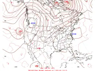 Ces conditions ont mené à un blocage météorologique de type Rex sur la Colombie-Britannique et le nord-ouest des États-Unis[10]. Dans cette situation, un anticyclone stationnaire ne laisse pas passer les dépressions ce qui aurait pu refroidir la région. Il forme plutôt un dôme de chaleur, alors que l'air déjà chaud se réchauffe plus rapidement que d'habitude, intensifiant la crête[11]. En effet, le , la valeur sur la carte géopotentielle de 500 hPa (à gauche) à Prince George, en Colombie-Britannique, était la plus élevée jamais enregistrée dans la région et les stations adjacentes ont également signalé des valeurs records[12]. Les vents descendants des montagnes ont réchauffé davantage l'air dans les vallées et le réchauffement climatique peut aussi avoir agi comme amplificateur du phénomène[13].