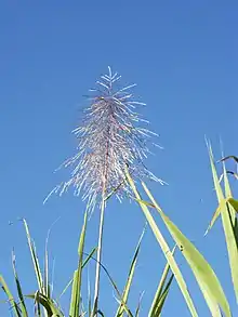 L'inflorescence est une panicule terminale de cinquante centimètres à un mètre de long. En culture, la canne est généralement coupée avant floraison. C'est une plante vivace par sa souche rhizomateuse.