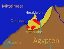 Les sites engloutis (Sérapéum suiveur de l'Osirium) sous les eaux de Canope et de Thônis-Héracléion ont été découverts et explorés par Franck Goddio[1],[2],[3].