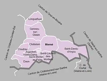 Ce canton était organisé autour de Bierné dans l'arrondissement de Château-Gontier. Son altitude varie de 19 m (Daon) à 116 m (Longuefuye) pour une altitude moyenne de 65 m.
