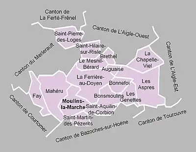 À la suite du redécoupage des cantons pour 2015, les communes de Saint-Aquilin-de-Corbion et Saint-Martin-des-Pézerits sont rattachées au canton de Mortagne-au-Perche, les communes de Fay, Mahéru et Saint-Pierre-des-Loges à celui de Rai et les communes des Aspres, Auguaise, Bonnefoi, Bonsmoulins, Brethel, La Chapelle-Viel, La Ferrière-au-Doyen, Les Genettes, Le Ménil-Bérard, Moulins-la-Marche et Saint-Hilaire-sur-Risle à celui de Tourouvre.