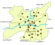 Rennes découpée en cantons (sans les communes limitrophes). Les points sont les bureaux de vote.
