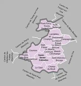 Le canton de Saint-Sever-Calvados comptait 7 226 habitants en 2012 (population municipale) et regroupait dix-huit communes :