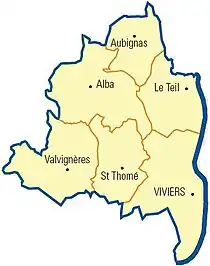 | Viviers (chef-lieu) | 07346 | CC Du Rhône aux Gorges de l'Ardèche | 34,15 | 3 788 (2014) | 111
