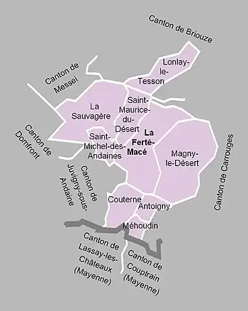 À la suite du redécoupage des cantons pour 2015, la commune de Couterne est rattachée au canton de Bagnoles-de-l'Orne, les communes de La Ferté-Macé, Lonlay-le-Tesson, Saint-Maurice-du-Désert, Saint-Michel-des-Andaines et La Sauvagère à nouveau à celui de La Ferté-Macé — auquel s'ajoutent une commune du canton de Carrouges et neuf du canton de Messei — et les communes d'Antoigny, Magny-le-Désert et Méhoudin à celui de Magny-le-Désert.