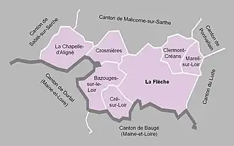 Les anciennes communes suivantes sont incluses dans le canton de la Flèche[24] :