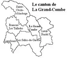 Un nouveau découpage territorial du Gard entre en vigueur à l'occasion des élections départementales de mars 2015, défini par le décret du 24 février 2014[2], en application des lois du (loi organique 2013-402 et loi 2013-403)[3]. Les conseillers départementaux sont, à compter de ces élections, élus au scrutin majoritaire binominal mixte. Les électeurs de chaque canton élisent au Conseil départemental, nouvelle appellation du Conseil général, deux membres de sexe différent, qui se présentent en binôme de candidats. Les conseillers départementaux sont élus pour 6 ans au scrutin binominal majoritaire à deux tours, l'accès au second tour nécessitant 12,5 % des inscrits au 1er tour. En outre la totalité des conseillers départementaux est renouvelée. Ce nouveau mode de scrutin nécessite un redécoupage des cantons dont le nombre est divisé par deux avec arrondi à l'unité impaire supérieure si ce nombre n'est pas entier impair, assorti de conditions de seuils minimaux[4]. Dans le Gard, le nombre de cantons passe ainsi de 46 à 23. Le nombre de communes du canton de la Grand-Combe passe de 6 à 28.