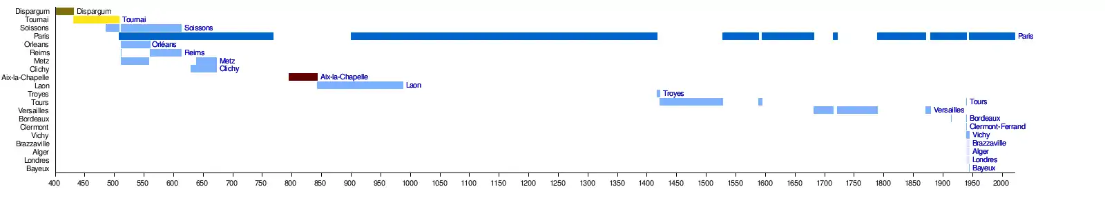 | 486 - 508 | Soissons | Soissons est de facto capitale des Francs saliens à la suite de la bataille de Soissons et de la conquête des dernières possessions gallo-romaines par Clovis. |
