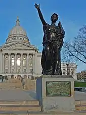 La statue Wisconsin (en) du dôme est sculpté en 1920 par Daniel Chester French de New York. Sa main gauche porte un globe avec un aigle dessus et son bras droit est tendu pour symboliser la devise de l’État « Forward » (« en avant »). La statue porte un casque avec l'animal de l'État, le blaireau, dessus. Elle est creuse en bronze couvert de feuilles d'or. La statue fait 4,7 m de haut pour un poids de 3 t. La statue est souvent nommée par erreur « Lady Forward » ou « Miss Forward », qui est le nom d'une autre statue du Capitole.