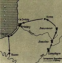 Vers 20 heures en ce 23 mai 1430, Jeanne d'Arc sort de Compiègne à la tête de ce groupe d'hommes et attaque le camp bourguignon. Mais les Anglais réussissent à esquiver son attaque. Très vite, les Français voient le danger et se replient sur Compiègne. Auprès de Jeanne d'Arc, il ne reste plus que quelques hommes fidèles, parmi eux son frère Pierre d'Arc. Le tabard rouge (manteau porté sur l'armure) que porte Jeanne d'Arc représente un point de repère pour l'ennemi. Jeanne d'Arc combat tant qu'elle peut mais un archer (demeuré anonyme) parvient à l'agripper et à la faire choir de son cheval. La Pucelle est capturée par deux capitaines bouguignons, Guillaume, bâtard de Wandonne[2] et très probablement Antoine de Bournonville[3]. Ils appartiennent à « la compagnie et (...) l'hôtel » du seigneur bourguignon Jean de Luxembourg. Le bâtard de Wandonne emmène Jeanne d'Arc à Margny[4].