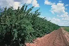 Haie de Caragana utilisée comme brise-vent. - Faune - Le caraganier de Sibérie est utilisé pour la nidification de plusieurs oiseaux comme le colibri. Les graines sont consommées occasionnellement par quelques espèces d'oiseaux. La plante n'est pas très appréciée des animaux, mais ses fleurs parfumées sont mellifères (350 kg/ha[2]). Le miel obtenu a un goût agréable, légèrement fruité. Il est clair et blanchit en cristallisant, avec une granulation moyenne.