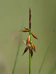 L'inflorescence est constituée d'un seul épi dressé ; les fleurs sont mâles situées à l'extrémité ; les fleurs femelles sont sous-jacentes, très lâches, brunes, dressées, puis se positionnant à l'horizontale. Les écailles femelles sont brunes à marge scarieuse, oblongues et obtuses, un peu plus courtes que les utricules ; les écailles mâles sont ovale-allongées et aiguës. L'utricule est d'environ 5,5 mm de longueur, brun orangé, luisant, pédicellé, en fuseau allongé, terminés en un bec court blanchâtre ; les stigmates sont au nombre de deux. La floraison a lieu en mai et juin[3].
