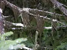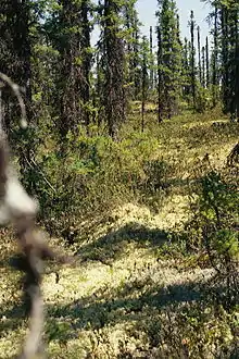 Dans les tourbières, le caribou forestier utilise surtout les prêles et le trèfle d’eau (Menyanthes trifolium), particulièrement au printemps[24]. En hiver, il préfère les lichens terricoles et, contrairement à l’écotype montagnard[25],[26] et n’utilise les lichens arboricoles qu’en dernier recours[21],[27]. Il creuse des cratères dans la neige (jusqu’à 120 cm)[27],[28] pour atteindre les lichens en s’aidant de stimulus olfactifs (nez enfoncé dans la neige ou dans les cheminées produites par les arbustes)[29] ou visuels (blocs erratiques, eskers, abords des marécages)[27].