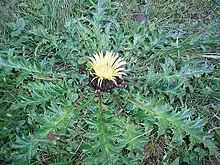 Plante vivace ou bisannuelle acaule (tige inexistante ou imperceptible). Grandes feuilles en rosette étalée, vertes à l'avers, blanchâtres au revers, pennatifides à lobes épineux. L'involucre possède trois types de bractées :