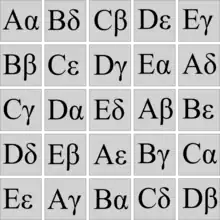 Leur superposition (ci-contre) est un carré gréco-latin car aucun couple de L × G n'est répété (donc chaque couple apparaît une fois et une seule) : on dit que les deux carrés latins sont orthogonaux.