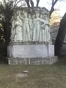 « Nessuno di noi dimentichi che questo marmo tribolato / ha nome libertà fratellanza fede di / Alberto Meschi / anarchico e sindacalista / costruttore di tempi migliori / magnifico operaio fra operai e reietti / cuore aperto alle ferite dell'uomo e della società / conquistò per cavatori e minatori / la riduzione della giornata lavorativa / sulle nostre terre / e per i puri all'alba della sua onestà / irradia da qui un sole che non vedrà mai tramonti / il popolo di Carrara. »