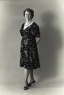 | Une photographie de Susanna Valenti posant devant l'enseigne de la Casa Susanna. | |
