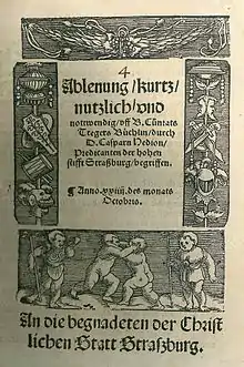 - Un livre d'Œcolampade, 1524 - (son titre en langue vulgaire devint : Ain schöne Epistel Oecolampadii an Caspar Hedion, das es zymlich nutz, und gut sey, das die Epistel und das Euangelium in dem ampt der Mess, in teutscher sprach, dem Volk vorgelesen und verkündet werd).