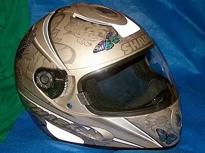 - C'est un casque léger et ouvert, qui coiffe les tempes en plus du sommet du crâne, mais qui n'offre pas ou peu de protection maxillo-faciale (l'avant du visage). Son utilisation est à éviter à vitesse élevée et en saison froide. Son poids est d'environ mille grammes, le champ visuel est élargi. Il peut être équipé d'une visière faciale. La dénomination « jet » reprend tous les casques dépourvus de mentonnière. Bien qu'ils satisfassent à tous les tests de sécurité imposés aux casques motos, l'absence de mentonnière les destine à des engins moins puissants, les scooters, les customs, les roadsters ou les trails. Fruit du marketing ou réelle diversification technique, le casque jet se décline sous différentes formes plus ou moins protectrices (jet, demi jet, micro-jet)[15].