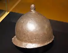 Le casque Nieder Mörmter, classé par Robinson comme Impérial Italique H , est l'un des casques impériaux romains les mieux conservés à avoir survécu à l'Antiquité. Fabriqué en bronze (une version en fer se trouverait dans une collection privée), le casque est fortement décoré et possède un protège-nuque beaucoup plus profond que d'habitude. Le contre vent croisé sur le crâne est en fait en relief plutôt qu'appliqué, et il y a un bouton en forme de dôme plutôt inhabituel où les accolades se rejoignent au sommet de la tête. Ce casque est généralement daté de la fin des époques Antonins ou Sévères,180-235 apr. J.-C., mais le contexte de découverte du casque est inconnu et la datation est basée uniquement sur sa typologie (c'est-à-dire qu'il semble environ 40 à 60 ans sur la piste évolutive du italique G)...