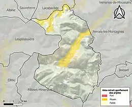 Le retrait-gonflement des sols argileux est susceptible d'engendrer des dommages importants aux bâtiments en cas d’alternance de périodes de sécheresse et de pluie. 12,2 % de la superficie communale est en aléa moyen ou fort (59,3 % au niveau départemental et 48,5 % au niveau national). Sur les 104 bâtiments dénombrés sur la commune en 2019, 18 sont en aléa moyen ou fort, soit 17 %, à comparer aux 85 % au niveau départemental et 54 % au niveau national. Une cartographie de l'exposition du territoire national au retrait gonflement des sols argileux est disponible sur le site du BRGM[32],[Carte 2].