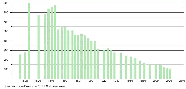 L'évolution du nombre d'habitants est connue à travers les recensements de la population effectués dans la commune depuis 1793. Pour les communes de moins de 10 000 habitants, une enquête de recensement portant sur toute la population est réalisée tous les cinq ans, les populations légales des années intermédiaires étant quant à elles estimées par interpolation ou extrapolation[52]. Pour la commune, le premier recensement exhaustif entrant dans le cadre du nouveau dispositif a été réalisé en 2007[53].