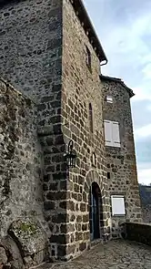 L'accès de l'enceinte est défendu par une porte voûtée dont la structure rappelle celle des portes des enceintes villageoises et serait datée du XVe siècle, mais sa partie basse en appareil moyen paraît plus ancienne (fin XIIIe - début XIVe siècles). Aujourd’hui, cet accès donne sur les anciennes cuisines des logis, mais jusqu’aux années 1970, la porte donnait directement accès à l’intérieur de la cour du château. Le donjon circulaire, de dix mètres de diamètre, comprend lui-même deux états : le plus ancien est composé d'un moyen appareil irrégulier, tandis que la partie supérieure est en moyen appareil régulier d'une belle qualité. Ce donjon a été détruit en partie au XIXe siècle.