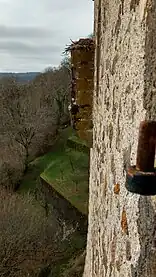 Des corbeaux de pierre dépassant de la façade du logis principal pourraient laisser penser que la passerelle mobile menant au donjon était relié à une sorte de balcon de bois soutenu par des aisseliers, courant le long de la façade des logis et redescendant dans la cour par des escaliers en Z le long de la tour ronde.