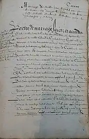 Le pacte de mariage de Gabriel de Carlat, écuyer, « seigneur de Castelnouel » est conservé aux archives départementales de l’Aveyron, et daté du 21 novembre 1584[26]. Le pacte est rédigé et signé après la célébration du mariage. Gabriel de Carlat épouse Louise de Lastic, fille du seigneur de Gabriac, devant témoins : Jean et Hugues de Conquans, François de Lauranet, écuyer, seigneur du Dat et de la Vernhe. Ils ont trois enfants connus, Jean, Antoine et Gabrielle. Le 5 mai 1625[27], Jean de Carlat est seigneur de la Serre et réside au Castel Noël. Sa mère, Louise de Lastic est décédée et son père Gabriel de Carlat, seigneur de Castel Noël s’est remarié avec Jeanne de Narbonne, qui lui survivra[25]. Il signe un pacte de mariage avec Jeanne de Masnau, fille de Bertrand de Masnau, sieur de Bosinhac et de Souiry, devant, entre autres, Paul de Frezals président au Parlement de Toulouse.